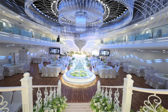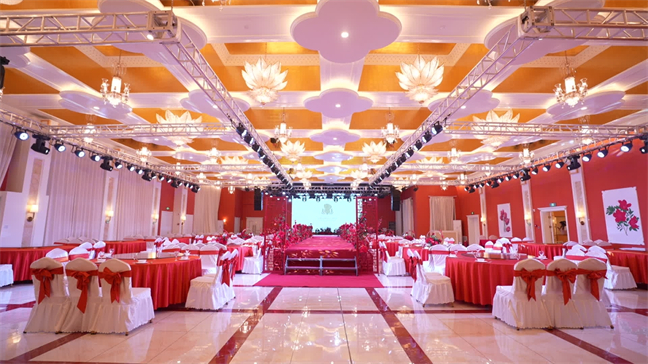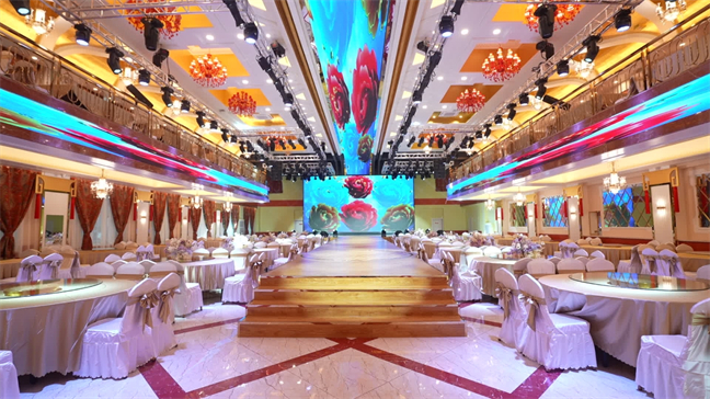 皇宮廳—金碧輝煌、皇宮式裝修,面積1038㎡,層高8.6米,配備愛(ài)情階梯、軌道威亞、二層觀(guān)禮臺(tái)、浪漫燈光秀、旋轉(zhuǎn)升降舞臺(tái)、頭頂天幕連接開(kāi)合大屏??沙薪?0桌的大型宴會(huì),也可舉辦600人的大型會(huì)議;還可用作會(huì)展、車(chē)展場(chǎng)地,每逢節(jié)假日還為市民上演文藝節(jié)目。