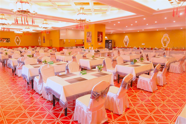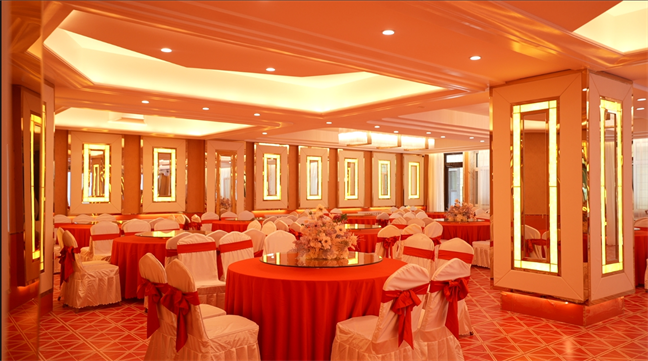 太陽(yáng)廳—面積323㎡,兼做早餐廳,可供 140人同時(shí)用餐;午晚時(shí)段,可改做宴會(huì)廳使用, 能夠承接16桌以下的宴席。